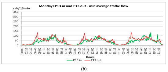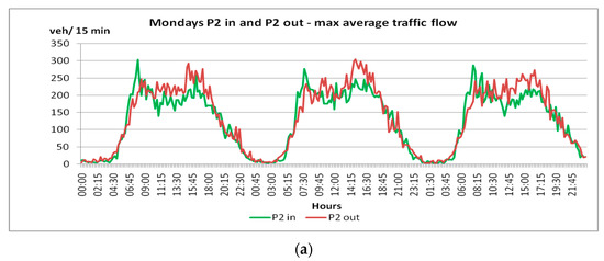 For point P2 in, traffic intensity values less than 50 [veh/15 min] occurred only on Monday and Thursday, while for point P2 out, the intensity values exceeded 50 [veh/15 min] on all working days from Monday to Friday. In turn, for the points P3 in and P3 out, the intensity values did not exceed 250 [veh/15 min].