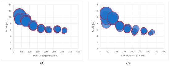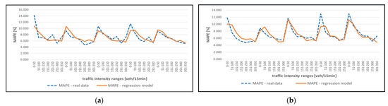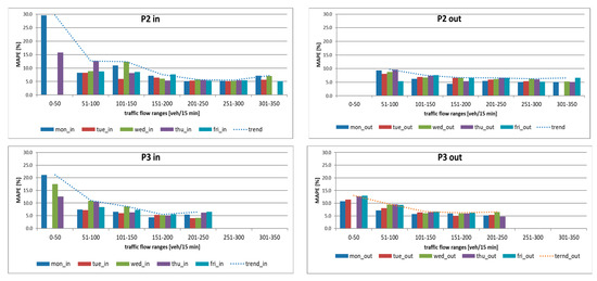 In Figure 6 it can be seen that the MAPE error for both points P2 and P3 stabilizes at a value of approximately 6–7% for the traffic intensity range above 150 [veh/15 min]. A similar situation occurs for the remaining measurement points.