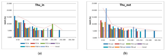 The values of MAPE error for all measurement points for Thursday; (a) for traffic flows entering the studied area (in); (b) for traffic flows exiting the study area (out).