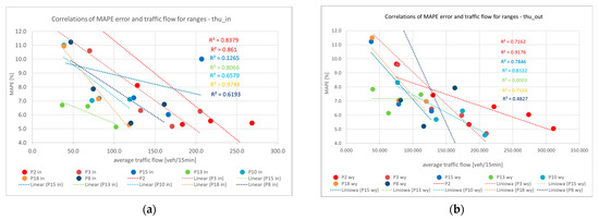 Dependence of the average MAPE error and the average traffic flows for intensity ranges; (a) for traffic flows entering the studied area (in); (b) for traffic flows exiting the study area (out).