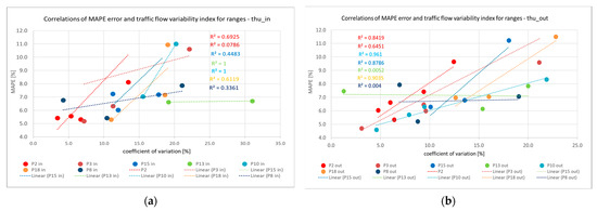 Dependence of the average MAPE error and the coefficient of variation for all measurement points for Thursday; (a) for traffic flows entering the studied area (in); (b) for traffic flows exiting the study area (out).