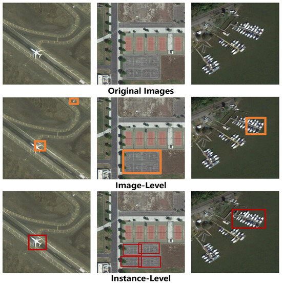Convolutional neural networks (CNNs) have facilitated the progress of different computer visual tasks [1,2,3,4,5,6], including object detection [7,8,9,10] in remote sensing images (RSIs). However, accurate bounding box (BB)-level annotations [11,12,13] are difficult to obtain. Due to the lacking of professional knowledge, manually annotating image- and BB-level labels by staff can be labor intensive and imprecise. In this paper, we focus on weakly supervised learning (WSL) for object detection.