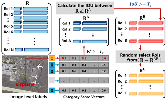 Since we attain the instance-level features and the corresponding proposal scores , the top-ranking proposal with its highly spatially overlapped regions can roughly determine the localization of objects, because the aforementioned proposals cover the most discriminative regions in images. As illustrated in Figure 3, the image-level annotation is ‘airplane’. After transferring image-level label into the one-hot vector, we obtain the transferred annotation , where the index 0 of denotes the corresponding category. Given the predicted scores , we select the corresponding row (index 0) of the category score vectors and put RoI features with category score higher than a threshold (0.5 in our experiments) into a subset of salient RoI features, named . Additionally, regions which are highly overlapped with may belong to the same category. Therefore, we calculate the IoU between and all other RoIs. When the IoU is larger than a threshold (0.5 in our experiments), we put these RoI features into a subset of salient RoI features, named . Finally, we randomly pick the remaining set () of RoI features to attain , until the number of the selected RoIs is equal to the defined threshold (300 in our model).