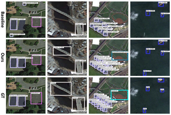 Visualizations of different methods on NWPU VHR-10.v2. The first row shows the detection results of baseline method and the second row shows the detection results of our proposed method. Taking the third row, visualizations of the ground true, as an indicator, we can clearly see that our method accurately detects the most instances.