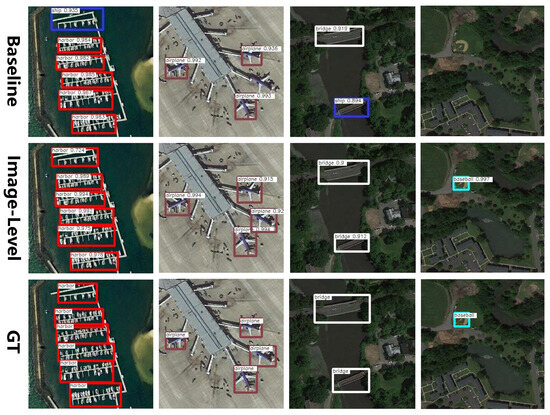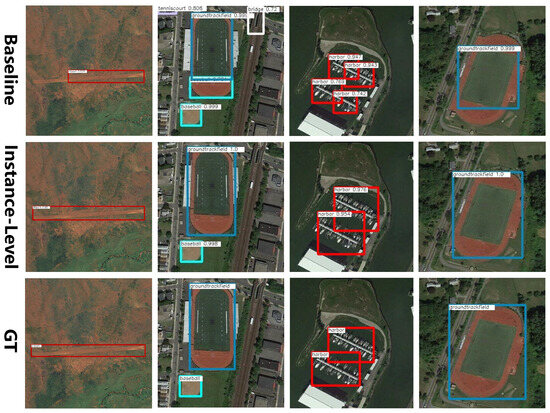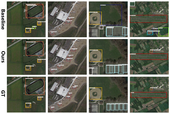 NWPU VHR-10.v2 [22] is modified from NWPU VHR-10 [48], which crops each image into 400 × 400 pixels. There are 1172 images in the NWPU VHR-10.v2 dataset. A total of 10 categories with 2775 instances are annotated in NWPU VHR-10.v2, namely, Airplane, Ship, Storage tank, Baseball diamond, Tennis court, Basketball court, Ground track field, Harbor, Bridge, and Vehicle. Following the standard protocols [21,22,23], our method uses 879 images for training and 293 images for testing.