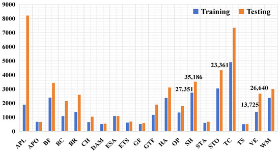 DIOR is more challenging than NWPU VHR-10.v2 and contains 23,463 samples with a size of 800 × 800 pixels. A total of 20 categories with 192,518 instances are annotated in DIOR, namely, Airplane, Airport, Baseball field, Basketball court, Bridge, Chimney, Dam, Expressway service area, Expressway toll station, Golf field, Ground track field, Harbor, Overpass, Ship, Stadium, Storage tank, Tennis court, Train station, Vehicle, and Windmill. DIOR is divided into training, validation and testing sets. All the previous WSOD methods [14,15,20,21,22,23,24,37,38,43,49,50] use a combination of training and validation for training (11,725 images). The remaining 11,738 images in the testing set are used for testing. In order to facilitate fair comparisons, we also adopt the aforementioned settings.