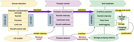Based on the characteristics of flash floods and high flood peaks in mountainous areas, we proposed a source reduction–process control–end treatment framework composed of storage pumping stations and LIDs, as shown in Figure 1. The framework consists of three systems: the source LID system, the drainage network, and the storage pumping stations. The LID system integrates decentralized green infrastructure components to reduce surface runoff volume and pollution at the source, easing the pressure on the pipeline network. The drainage network system collects and transports surface runoff and the storage pumping stations drain at the end. During drainage, rainwater acts as the key link connecting different components of the system. LIDs have limited capacity to regulate and store rainwater. Residual rainwater, which acts as a lower boundary condition for discharge, significantly impacts pipeline network design. However, when discharge exceeds the drainage network’s design standards, urban waterlogging, as a lower boundary condition, determines the capacity of storage tanks and pumping stations. Additionally, pollution concentration, another critical factor, is similarly considered in this framework.