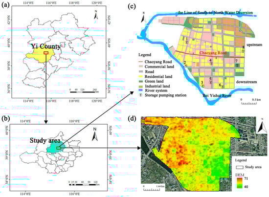 The schematic diagrams of the (a) Yi County location, (b) study area location, (c) land use types of the study area and distribution with storage pumping stations 1 to 8, and (d) DEM.