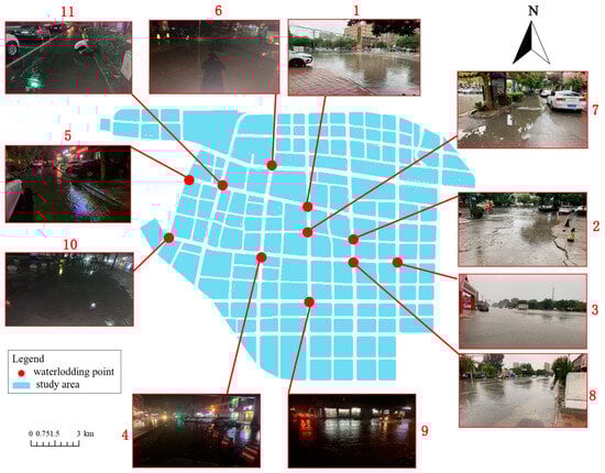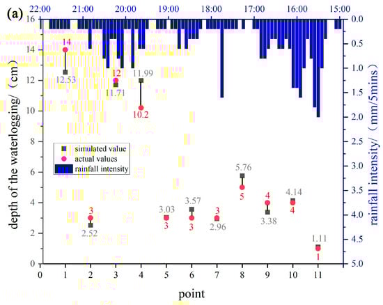 The extreme rainfall event in Yi County on 19 July 2016 caused extensive waterlogging and the distribution of severe waterlogging points was determined based on remote sensing images. To survey the waterlogging situation in this study area, the site survey was conducted in Yi County in July 2019, identifying eleven representative points chosen based on topography and the distribution of waterlogging, as illustrated in Figure 3. Two waterlogging monitoring experiments were conducted on 21 July 2019 and 12 July 2020, based on weather forecasts. The first rainfall event lasted 7 h with a total of 27 mm, and the second rainfall event lasted 9 h and had an average intensity. We monitored and recorded the process of road waterlogging and its maximum depth of waterlogging while measuring the extent of inundation and the recession time. The maximum waterlogging depth at the eleven points was calculated by averaging measurements taken near each point using a box ruler []. Relevant data is shown in Figure 4.