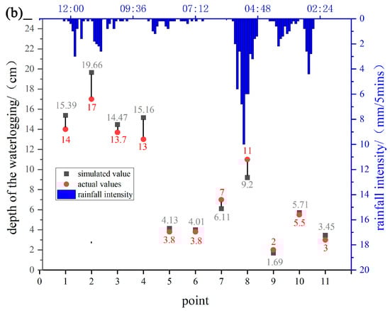 Simulated and measured values of maximum waterlogging depth under (a) “7.22” rainfall event in 2019 and (b) “7.12” rainfall event in 2020.