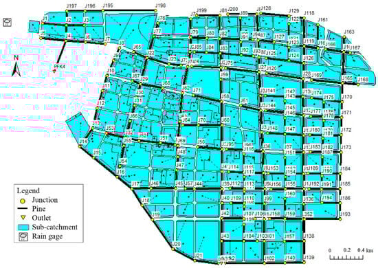 SWMM as an open source and free urban flood model, was initially proposed in 1971 and had upgraded SWMM 5.2. SWMM was widely used. It was chosen for this study due to its ability to simulate LIDs, storage pumping stations, and other relevant features. Runoff generation and sink flow processes were modeled separately using the nonlinear reservoir routing method and the de Saint-Venant equations. Additionally, infiltration was simulated through the application of the Horton method []. Eventually, this study area was generalized into 4 drainage zones, 351 sub-catchments, 196 nodes, 196 pipelines, and 4 drainage outlets by using the above data (Figure 5).