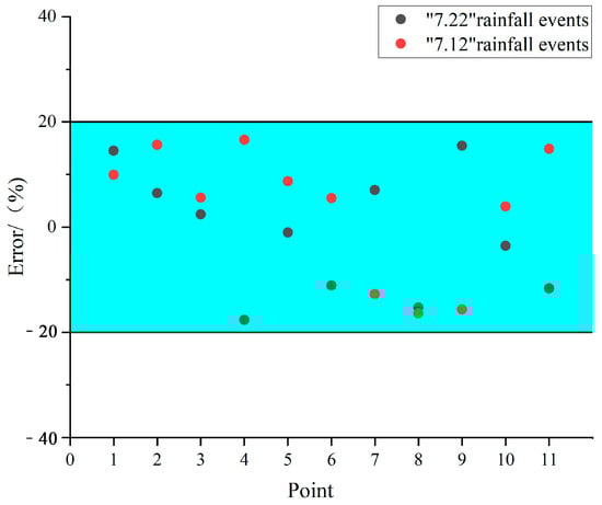The study area belongs to the central urban area with dense buildings. According to the above methods, the comprehensive runoff coefficient was calculated as 0.692 based on land use type. Non-deterministic parameters were adjusted multiple times until reaching this target value. Then, we calculated the error between simulated and measured values of maximum waterlogging depth under two rainfall events. The results indicated that the error of each waterlogging point was within 20%, which means the model performed well (Figure 6). The parameter values are shown in Table A2.