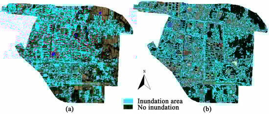 Distribution of inundated areas: (a) remote sensing images on 21 July 2019; (b) remote sensing images on 12 July 2020.