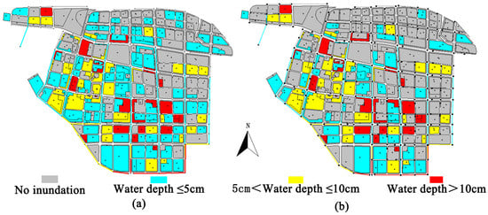 Distribution of inundated areas: (a) SWMM results on 21 July 2019; (b) SWMM results on 12 July 2020.