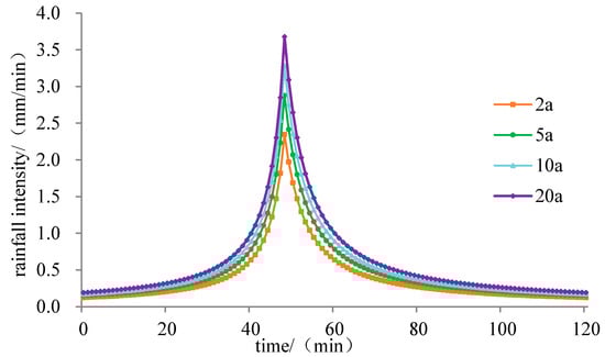 Rainfall was designed for return periods of 2, 5, 10, and 20 years referring to topography and design standards of pipe networks and pumping stations in Yi County. The rainfall intensities of a two-hour duration were calculated based on the Chicago design storm method [], and the Baoding rainstorm formula Equation (4), which are shown in Figure 9.