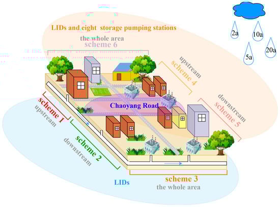 The study area was divided to compare runoff response mechanisms among LIDs implemented upstream, downstream, and throughout the entire area, ensuring similar control areas for both upstream and downstream LIDs. Considering significant topographical changes, land use types, and the orientation of the pipeline network, the area north of Chaoyang Road was designated as upstream (722.06 ha) and the south as downstream (477.95 ha), as shown in Figure 2. It was crucial to combine the three selected LIDs with 10% permeable pavements for residential and commercial areas, 60% sunken greenbelts for green land, and 1046 rainwater buckets (526 upstream and 520 downstream) near the building. LIDs were then implemented separately upstream, downstream, and in the entire area, creating three different spatial layouts. Three new schemes were formed by integrating LIDs with eight storage pumping stations. The control areas of a single LID and multiple LIDs were similar, both upstream and downstream. The six schemes are shown in Figure 10. Schemes 1 to 3 are only implemented LIDs separately upstream, downstream, and the whole area. Schemes 4 to 6 are based on the first three schemes and combined with eight storage pumping stations.