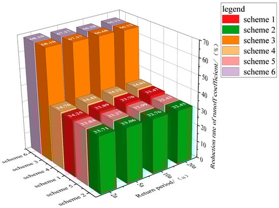 Reduction rate of runoff coefficient under six schemes for the return periods of 2, 5, 10, and 20 years.