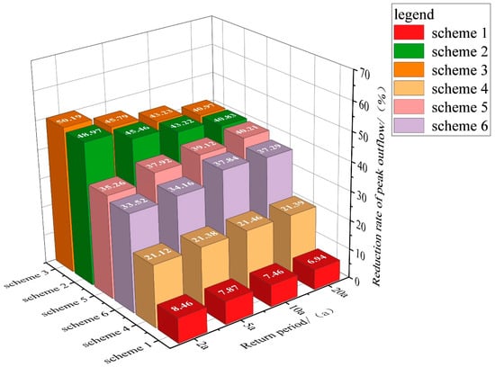 Reduction rate of peak outflow under six schemes for the return periods of 2, 5, 10, and 20 years.