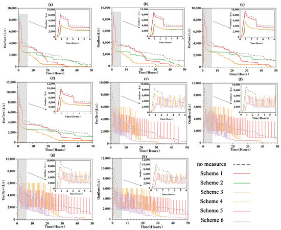 Outflow process of Schemes 1 to 3 for the return periods of (a) 2a, (b) 5a, (c) 10a, (d) 20a and Schemes 4 to 6 for the return periods of (e) 2a, (f) 5a, (g) 10a, (h) 20a.