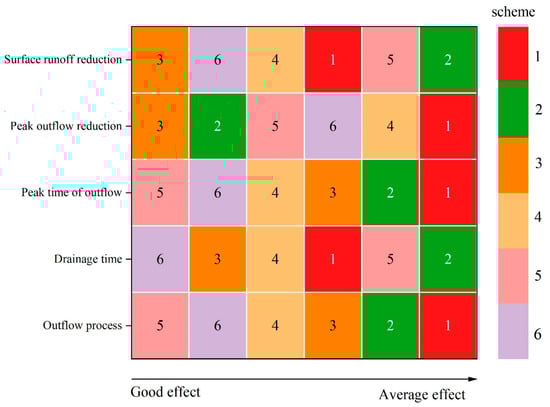 Prioritize the effects of six schemes on surface runoff reduction, peak outflow reduction, peak time of outflow, drainage time, and outflow process.