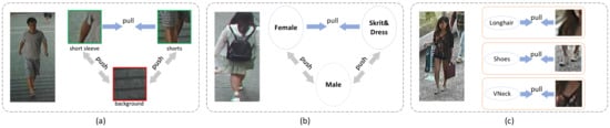 To alleviate the above-mentioned issues, it is desirable to fully explore the inter-region, inter-attribute, and region-attribute mapping relations in the PAR task. For the inter-region relation modeling as shown in Figure 1a, the regions of the human body are related to each other; for example, short sleeves and shorts are mutually pushed from the background of the image. We need to eliminate the spatial data redundancy under background distraction and analyze long-range dependencies between regions. For example, in the process of identifying specific attributes (like age and gender), our attention may concentrate on multiple local regions, including those around the head, arm, leg, upper body, and lower body, and associate long-distance relations among these regions. Since Convolutional Neural Networks (CNNs) are struggling with learning long-distance dependencies, some existing methods adopt atrous convolutions [], Feature Pyramid Networks (FPN) [], Long Short-Term Memory (LSTM) [,], and Graph Convolutional Networks (GCN) [,,] to alleviate the aforementioned limitation. Recently, some recent works [] apply Vision Transformer (ViT) [] as a feature extractor due to its capacity to capture long-distance relations between regions. In contrast, we construct a Masked Region Relation Module (MRRM) to focus on precise spatial attention regions to extract more robust features with masked random patch training.