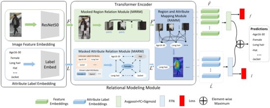 Relational Modeling Modules. We mainly construct relational modeling with three modules: Masked Region Relation Module (MRRM) for inter-region relation modeling, Masked Attribute Relation Module (MARM) for inter-attribute relation modeling, and Region and Attribute Mapping Module (RAMM) for region-attribute mapping relation modeling. All three modules adopt the Transformer encoder architecture but differ in inputs and learning strategies. MRRM inputs the image feature embeddings F extracted by the backbone, a subset of features is randomly sampled, and the remaining features are masked with a masked random patch training strategy. MARM inputs the attribute label embeddings L and adopts the attribute label masking strategy to randomly eliminate a specific number of attribute labels. During training, it utilizes the ground truth of the remaining labels to predict the masked ones. MRRM and MARM output newly generated visual features and attribute label embeddings , respectively. With and as inputs, RAMM learns the cross-modal alignment between spatial regions and semantic attributes and outputs the final visual features and attribute label embeddings .