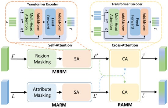 Transformer-based models [] were originally widely used in the field of natural language processing (NLP) [,] and have recently demonstrated excellent performance on computer vision (CV) tasks [,,]. Vision Transformers (ViT) [] were presented to split the images into sequences of image patches and then a standard Transformer encoder was applied to handle the image classification problem. To tackle the object detection task, DETR [] regarded object detection as a direct set prediction task and assigned direct set prediction via transformers and bipartite matching. For the object re-identification task, TransReID [] proposed a pure transformer-based object ReID framework in which a jigsaw patch module (JPM) is designed to learn more robust features, and side information embeddings (SIEs) are introduced to incorporate non-visual clues. At the same time, in other CV tasks, such as image captioning [], cross-view gait recognition [], video object detection [], and image fusion [], Transformer has shown its outstanding potential. The achievements of Transformers are primarily due to their success in the self-supervision and self-attention mechanisms []. Self-supervision enables the training of intricate networks without the expense of manual labeling while also encoding valuable relationships between presented entities. On the other hand, self-attention considers the correlation of the input sequence (like patches or words) by learning the correlations between the tokens. Some approaches [,,,] showcase the Transformer architecture’s capability in capturing relations within sequences. In this paper, we also leverage the Transformer encoder to explore relations of regions, relations of attributes, and mapping relations between regions and attributes, with its ability to capture long-distance dependencies from the global view.