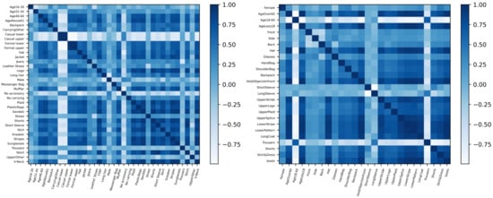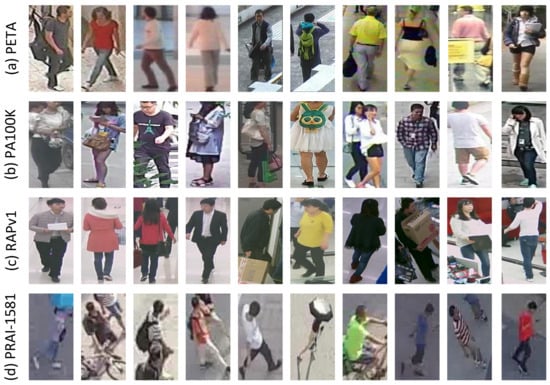 PETA is a small-scale dataset for pedestrian attribute recognition, as shown in Figure 4a. It contains 8705 persons and consists of 19,000 images of individuals. Each image in the dataset is manually labeled with 65 attributes (61 binary and 4 multi-class). The dataset undergoes a random split into three subsets: 9500 images for the training set, 1900 images for the validation set, and 7600 images for the testing set. As per the evaluation in [], 35 attributes that are chosen based on their positive ratios with a threshold set at 5% or higher are selected from the dataset. These chosen attributes are then employed for subsequent analysis and evaluation.
