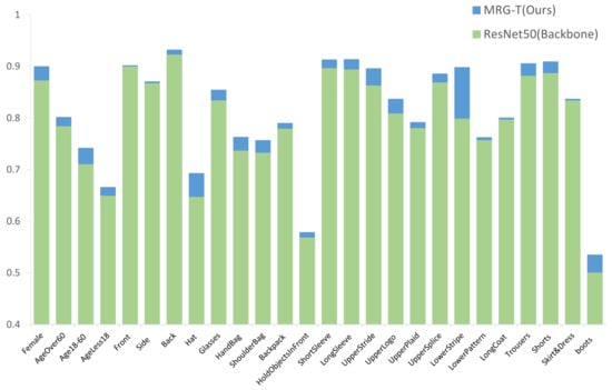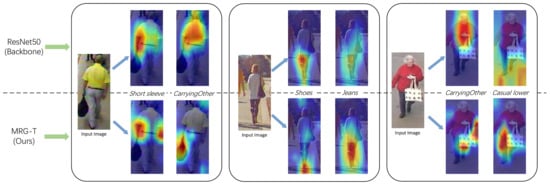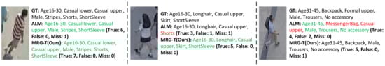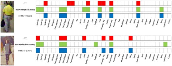 Experimental settings. The proposed MRG-T is implemented in the Pytorch framework [] on two NVIDIA GTX 2080Ti GPUs and trained end-to-end. Each input image is resized to 224 × 224 for training. We employ the common data augmentation techniques including random horizontal mirroring, random rotation, and color jittering. The Adam optimizer [] is leveraged as a stochastic gradient descent algorithm for training deep learning models, where , and weight decay . The initial learning rate is set to 1e-4 and is reduced by a factor of 0.1 at the 20th, 30th, and 40th epochs. The total number of epochs for training is determined as 60, with the exception of the PA100K dataset, which requires a longer training period of 90 epochs due to its large-scale images []. For inference, all test images are also resized to 224 × 224 and then augmented only by normalization.