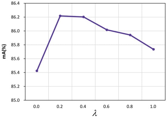 To assess the performance of the method, we employ five commonly used metrics in the PAR task to evaluate the pedestrian attribute recognition performance consisting of four instance-based evaluation metrics as well as a label-based evaluation metric. For the instance-based evaluation metrics, Acc (accuracy), Prec (precision), Rec (recall), and F1 (F1-score) are used to evaluate the recognition performance of PAR methods at the instance level. In terms of the label-based evaluation metric, mA (mean accuracy) computes the classification accuracy for each attribute individually and then takes the average as the evaluation score. In contrast to the instance-based evaluation metrics, the label-based evaluation metric provides a more comprehensive assessment, taking into account all evaluation criteria, namely the average classification accuracy of both positive and negative samples. As a result, prior studies [,] have placed greater emphasis on mA, which offers a more robust and effective means of validating the proposed method.