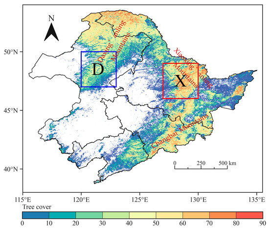 Study area. Red rectangular box labeled X represents a section of Xiaoxing’anling Mountains. Blue rectangular box labeled D represents a section of Daxing’anling Mountains. Background map shows spatial distribution of tree cover in study area.