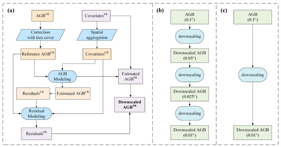 (a) Flowchart detailing downscaling process for AGB; (b) flowchart of SBSD method; (c) flowchart depicting DD approach.