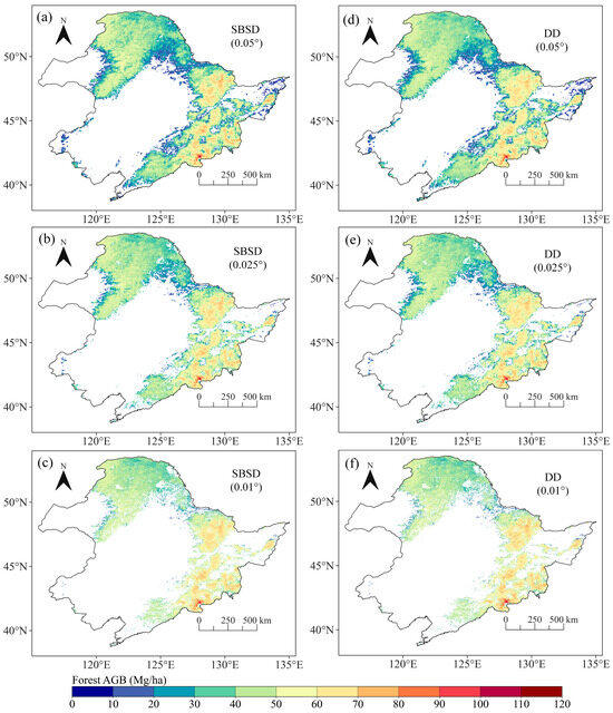 Comparative analysis of multi-scale AGB maps derived by SBSD method and corresponding aggregated AGB maps obtained through DD method. (a–c) Downscaled AGB using SBSD method at 0.05°, 0.025°, and 0.01° resolutions; (d–f) aggregated AGB maps.