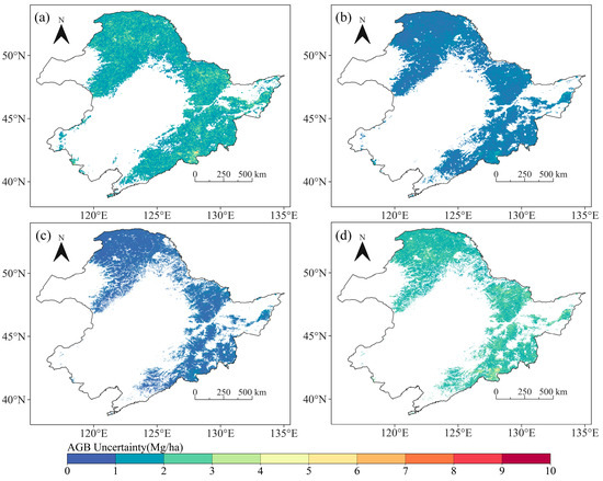 Furthermore, we employed the optimal SBSD method to generate forest AGB maps and associated uncertainty maps for 2010 at resolutions of 0.05°, 0.025°, and 0.01°. The methodology proposed in this study is applicable to larger spatial scales, such as China or global regions, and can be readily extended to higher spatial resolutions, representing a potential avenue for future research.