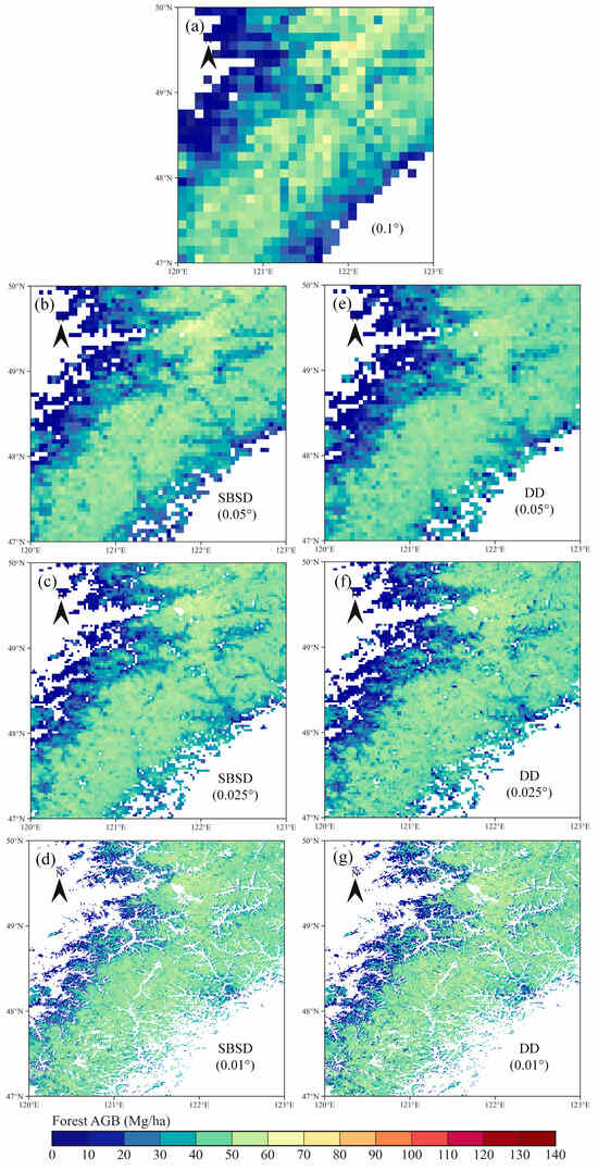 We conducted a comparative analysis of carbon stocks between the DD and SBSD methods. The total forest biomass in the northeast region for the year 2010 was calculated by summing the AGB of all forest pixels. The corresponding carbon stocks were computed by applying a standardized coefficient of 0.5 (Table 3) [48]. At the initial resolution of 0.1°, the carbon stock was estimated at 1.438 Pg C. From 0.1° to 0.05° scale, the carbon difference was 0.036 Pg C and 0.061 Pg C for DD and SBSD methods, respectively. From 0.05° to 0.025° scale, the carbon difference was 0.072 Pg C and 0.049 Pg C for DD and SBSD methods, respectively. From 0.025° to 0.01° scale, carbon difference was 0.184 Pg C and 0.180 Pg C for DD and SBSD methods, respectively. From 0.1° to 0.05° scale, the percentages of the carbon difference were 2.5% and 4.2% for DD and SBSD methods, respectively. From 0.05° to 0.025° scale, the percentages of the carbon difference were 5.1% and 3.6% for DD and SBSD methods, respectively. From 0.025° to 0.01° scale, the percentages of the carbon difference were 13.8% and 13.6% for DD and SBSD methods, respectively. When the spatial resolution went from 0.1° to 0.01°, the percentage of carbon differences for DD and SBSD methods all showed an overall increase. This indicated that when the spatial resolution increased, the variation of carbon stock also increased. Simultaneously, the forest area was 70.82, 64.97, and 51.4 million ha at 0.05°, 0.025°, and 0.01° scales, respectively. The different forest areas at three scales were attributed to the effect of mixed forest pixels. At low spatial resolutions, there were a large number of mixed forest pixels. With the increase in spatial resolution, non-forest pixels that were counted within forest pixels at the coarse resolutions were excluded, resulting in progressively smaller forest areas and corresponding smaller carbon stocks. The SBSD method demonstrated a lower carbon stock difference compared to the DD method.