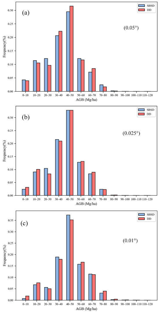 (a–c) Histogram of downscaled forest AGB using SBSD and DD methods at 0.05°, 0.025°, and 0.01° resolutions.