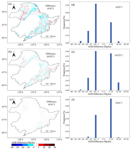 (a–c) Difference maps between AGB obtained through SBSD and corresponding aggregated AGB maps by DD method at resolutions of 0.05°, 0.025°, and 0.01°; (d–f) pixel frequency histograms associated with AGB difference.