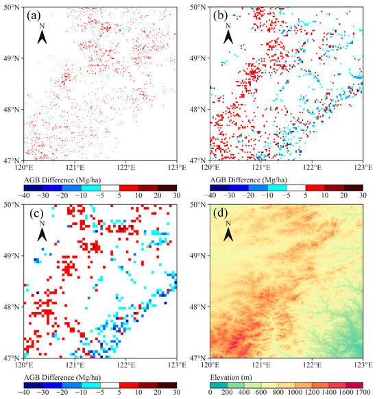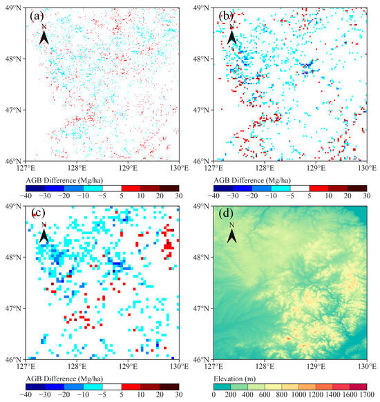 (a–c) AGB difference maps in low-elevation area of Xiaoxing’anling Mountains at 0.01°, 0.025°, and 0.05° resolutions; (d) corresponding elevation map.