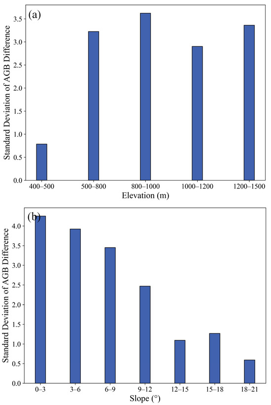 High-elevation area of Daxing’anling Mountains. (a) Standard deviation of AGB difference per elevation class; (b) standard deviation of AGB difference per slope class.