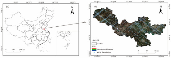 (a) Map of China’s administrative divisions; (b) Xuzhou administrative district, multispectral image and GEDI footprints distribution.