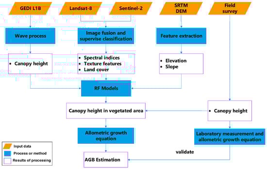 The flowchart of estimating the canopy height and AGB of vegetation using GEDI and optical images.