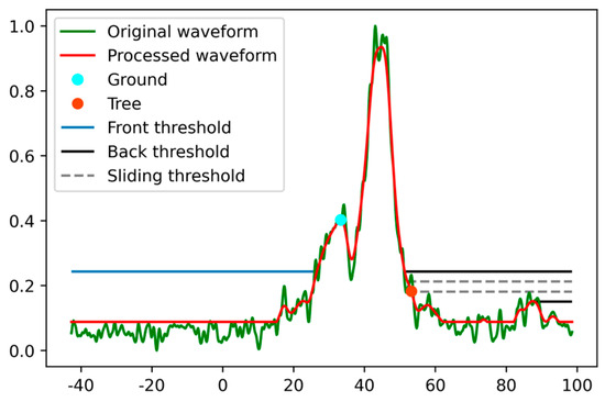 The first valid echo is defined as the rightmost intersection of the post-threshold with the normalized smooth waveform (orange point in Figure 4), and the ground echo is defined as the peak Gaussian component on the last valid echo with the peak Gaussian greater than the pre-threshold (blue point in Figure 4). The canopy height is equal to the elevation corresponding to the first valid echo minus the elevation corresponding to the ground echo.