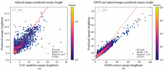 (a) Scatter plot between the canopy height modeled by UAV imagery and the prediction canopy height estimated by optical images; (b) Scatter plot between the canopy height extracted by GEDI and the predicted canopy height estimated by GEDI joint optical images.
