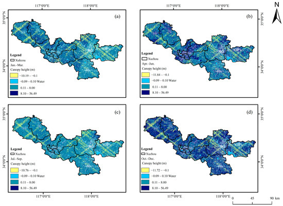 Distribution of spatially continuous vegetation canopy height only using optical image inversion. (a) January–March, (b) April–June, (c) July–September, and (d) October–December.