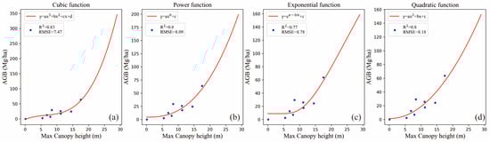 Comparison of four fitting functions for the relationship between max canopy height and measured AGB. (a) cubic function; (b) power function; (c) exponential function; (d) quadratic function.