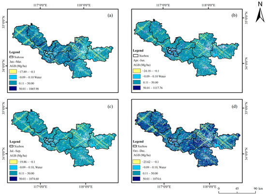 Distribution of spatially continuous AGB using GEDI laser points and optical images inversion in four seasonal periods. (a) January–March, (b) April–June, (c) July–September, and (d) October–December.