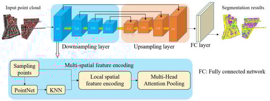 PointMM mainly consists of four parts: the Balanced Class Sampling (BCS) module, the downsampling layer incorporating multi-spatial feature encoding and multi-head attention pooling, the up sampling layer, and the fully connected layer. Firstly, the training samples V are obtained using BCS, and each sampling center point vi and its neighborhood points vi,k are extracted based on FPS and feature KNN. At this point, we obtain a point cloud of dimensions N × K × D, where N is the number of sampling center points, K is the number of neighborhood points, and D is the dimensionality of the point cloud containing coordinate and attribute information. Then, the sampling points and their neighborhood points are passed through the multi-spatial feature encoding module to obtain features ηi of dimensions N × K × 13. Subsequently, the features ηi are input into the multi-head attention pooling module, which integrates neighborhood features through pooling operations to generate a larger receptive field and more global feature vector MP(Fi). It is worth noting that we set up four downsampling layers, so the number of attention heads for each layer is 2n (n ∈ [1, 4]). The initial input to the downsampling layer in this paper is a point cloud of dimensions N × K × D, and the number of sampled points in each subsequent layer is multiplied by 4−n (n ∈ [1, 4]), where n represents the downsampling layer. Additionally, the output of the downsampling layer is feature maps of dimensions N/4 × 64, N/16 × 128, N/64 × 256, and N/256 × 512. Meanwhile, the upsampling results are cascaded with corresponding downsampling levels using 3D interpolation and skip connections to effectively fuse low-level to high-level features. Finally, a fully connected layer is utilized to establish the transformation relationship between point cloud features and label results. It should be noted that unlike PointNet++ using FPS for the indiscriminate downsampling of large-scale point cloud data, we have designed BCS to perform a complete sampling of minority class samples and downsampling of majority class samples, ensuring that the network learns each class as well as possible through the sampling points.