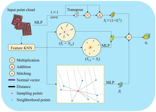 In Figure 2, the input point cloud is denoted as V = {ni|i = 1, …, N}, where N is the number of points, and ni = [vi, ri] ∈ R3+d represents the combination of coordinate information vi and attribute information ri. To save computational costs, point cloud V is first subjected to feature extraction using the PointNet encoding method [17]. Then, in the feature space, neighborhood point sampling is performed using k-nearest neighbors (KNN). On this basis, the neighboring points vi,k that are searched are more likely to belong to the same object category as the central point vi or are on the edges between categories. Therefore, obtaining neighborhood points through feature space KNN helps the network learn the feature information of the sampled points’ categories while increasing the distinctiveness of inter-class features. However, the feature encoding method of PointNet has limited capabilities in representing point cloud topological structures and spatial scales.