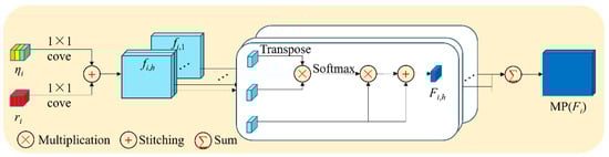 Fi,h = [SoftMax((fi,hT × fi,h)/√C) + 1] × fi,h, fi,h = [g(ηi)⊕g(ri)]h