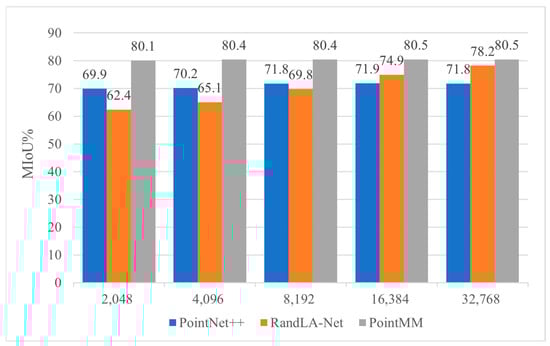 To further validate the feature learning capabilities of the proposed network at different sampling densities, this section conducts experiments with different numbers of sampled points, specifically 2048, 4096, 8192, 16,384, and 32,768 points. Additionally, we compare our PointNet++, RandLA-Net, and the proposed method, and the MIoU scores for each model are shown in Figure 5.